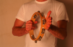Gleiches wie für den Shaker gilt für den Tambourine, der allerdings im Regelfall anstatt vom Körper weg, bzw. zu ihm hin (siehe Shaker) vor dem Körper (oder Brust) seitlich hin und herbewegt wird.